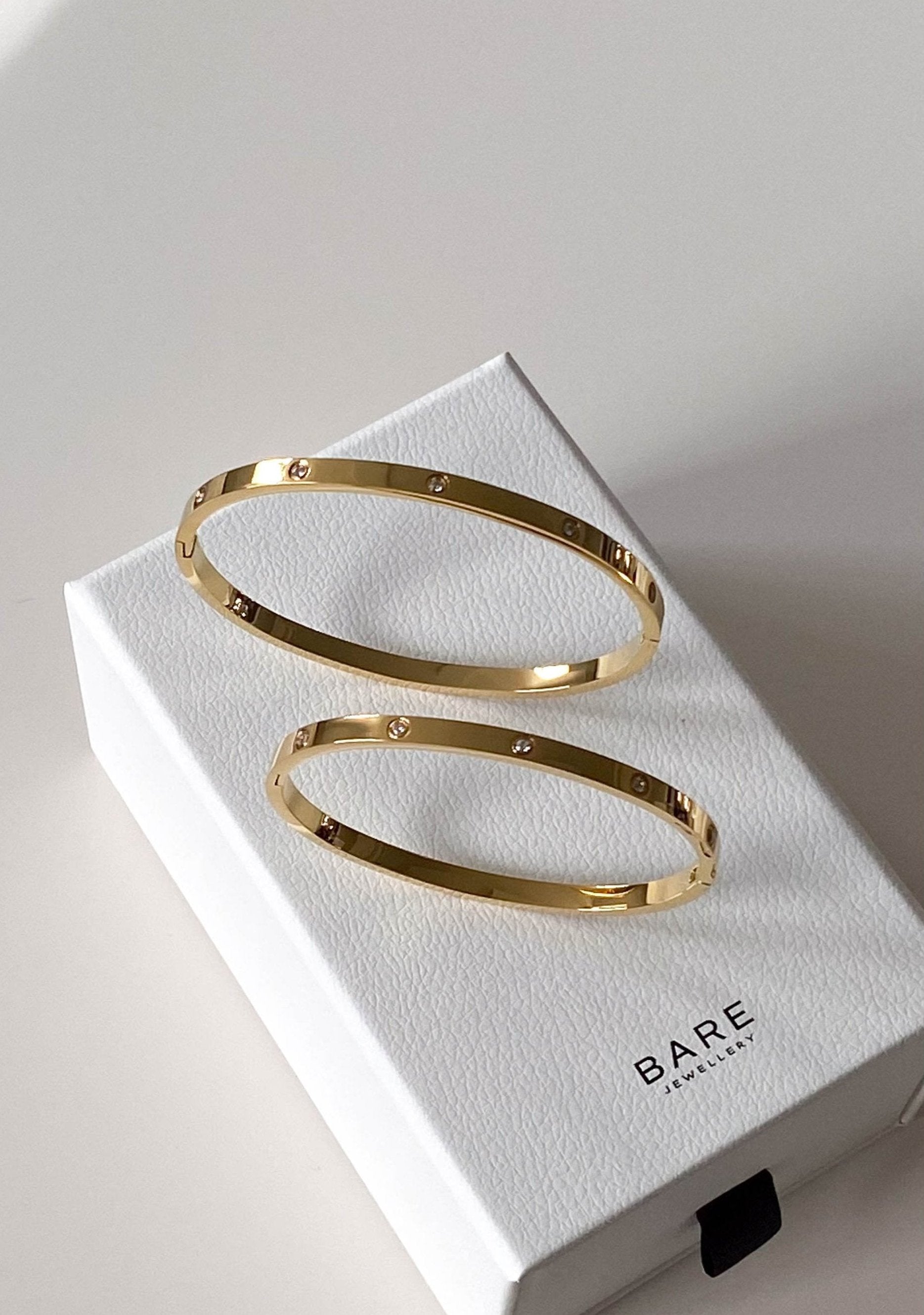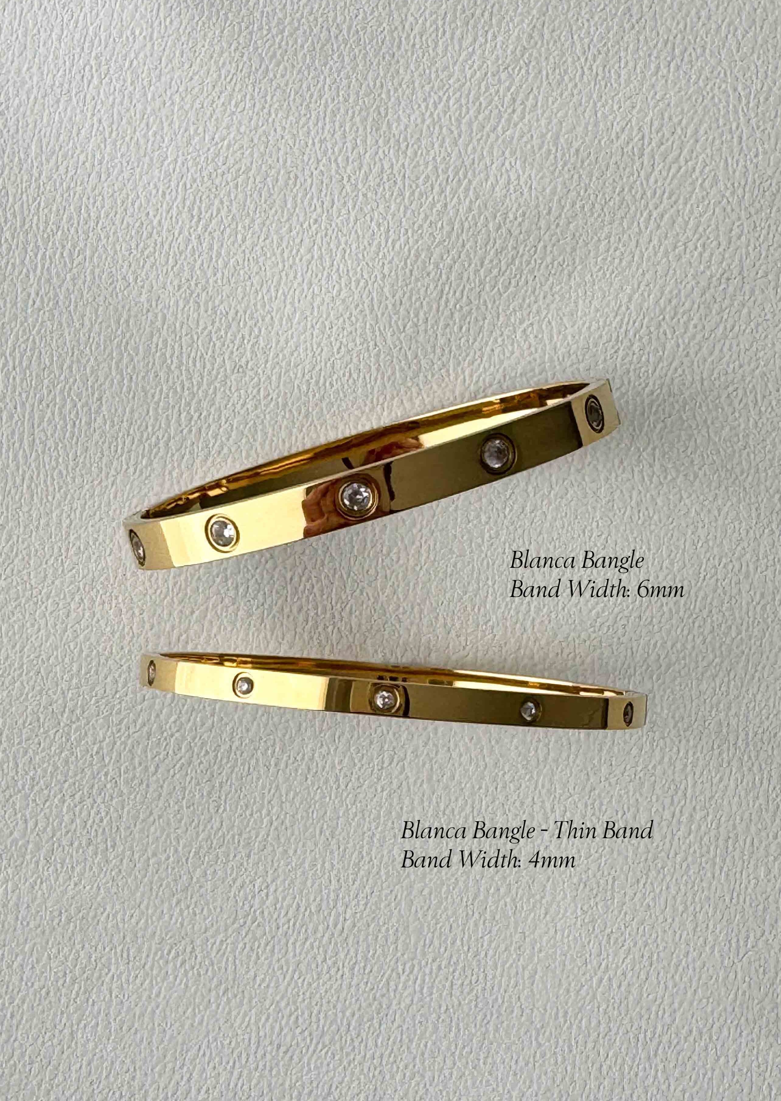 The Blanca Bangle Thin Band offers the same timeless elegance as our classic Blanca, in a slimmer and more subtle silhouette. Waterproof and tarnish-resistant, it’s the perfect delicate staple for minimal impact or stacked to complete your jewellery collection.