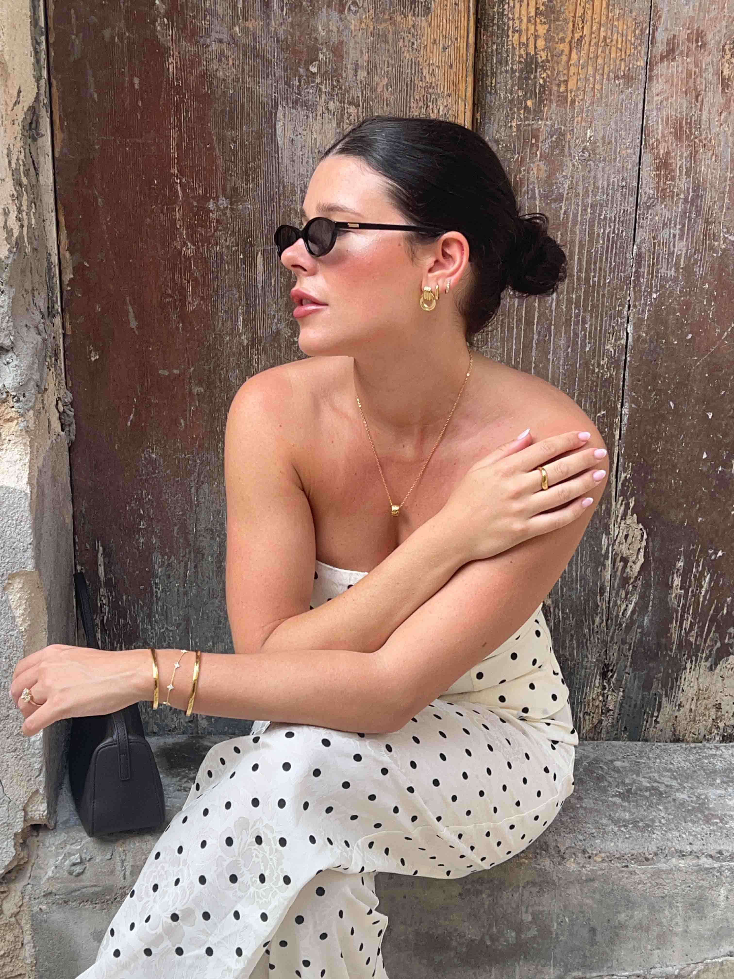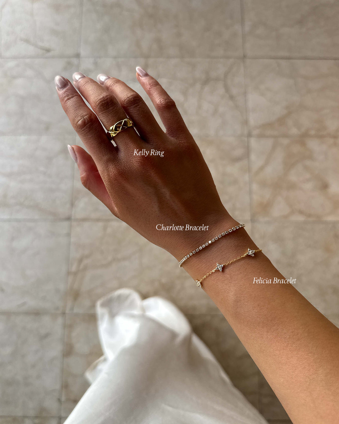 Delicate, sparkly and summer-inspired, the Felicia Bracelet glistens like sunlight on water. It lays beautifully on the wrist and pairs perfectly with our signature pieces like the Phoebe Bangle. Waterproof and skin-friendly, made to take you from day to night.
