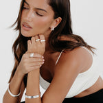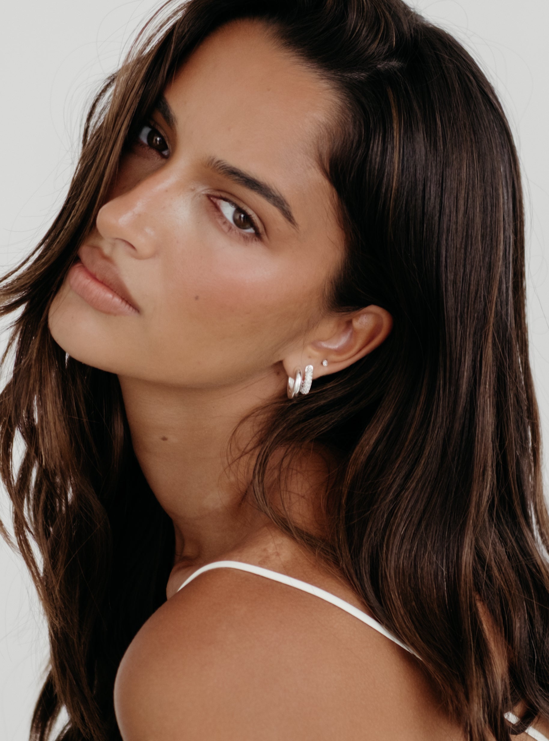 The Lya Hoops in Bright Silver are the ultimate modern statement. Featuring a high-shine silver finish that instantly brightens and complements every skin tone, they add the perfect pop to any look. Lightweight, waterproof, and effortlessly chic.